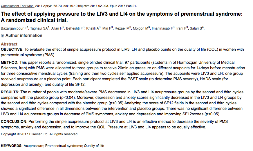 Estudio: Digitopresión en las 4 puertas (H3 – Taichong + IG4 – Hegu) efectivo para disminuir el síndrome premenstrual: