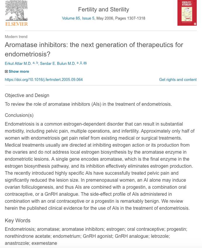 Según el siguiente estudio  publicado en la prestigiosa revista Fertility & Sterility los inhibidores de la aromatasa podrían ser la futura solución para tratar la endometriosis: