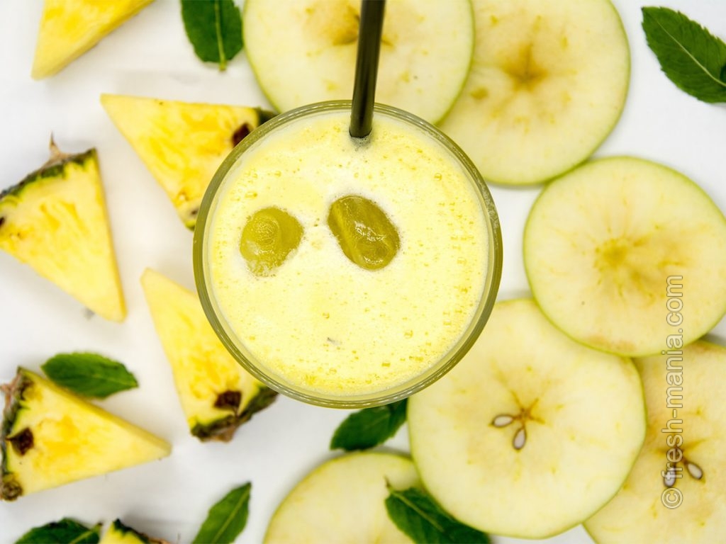 El jugo de piña va bien con varias verduras, frutas y hierbas. Mezcla fresca simple y deliciosa: manzana + naranja + piña.