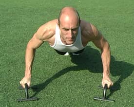 Tome un énfasis acostado. Empújese hasta la mitad del suelo y quédese en esa posición. Aquí los músculos del cuerpo y de los brazos realizan un trabajo estático (foto a la derecha encima de estas líneas).