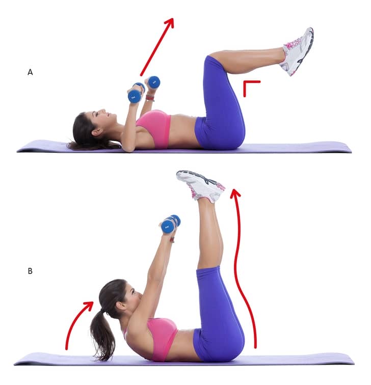 - Acuéstese boca arriba con los brazos cruzados sobre el pecho, sosteniendo pesas y doble las rodillas a 90 grados.