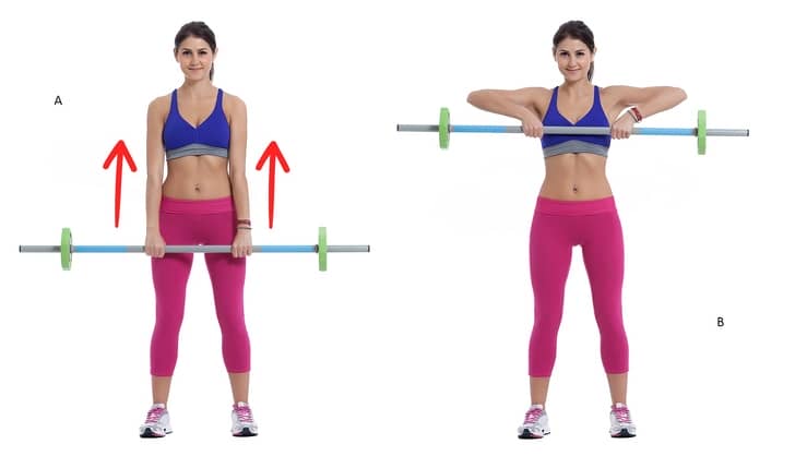 - Ponte de pie y sostén una barra (o mancuernas) en tus manos.