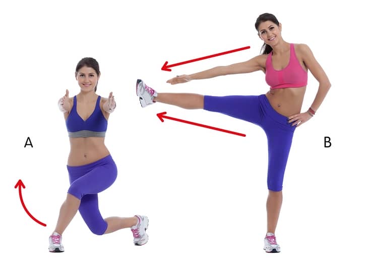 - Da un gran paso hacia atrás con el pie izquierdo, adelanta el pie derecho y haz una estocada cruzada.