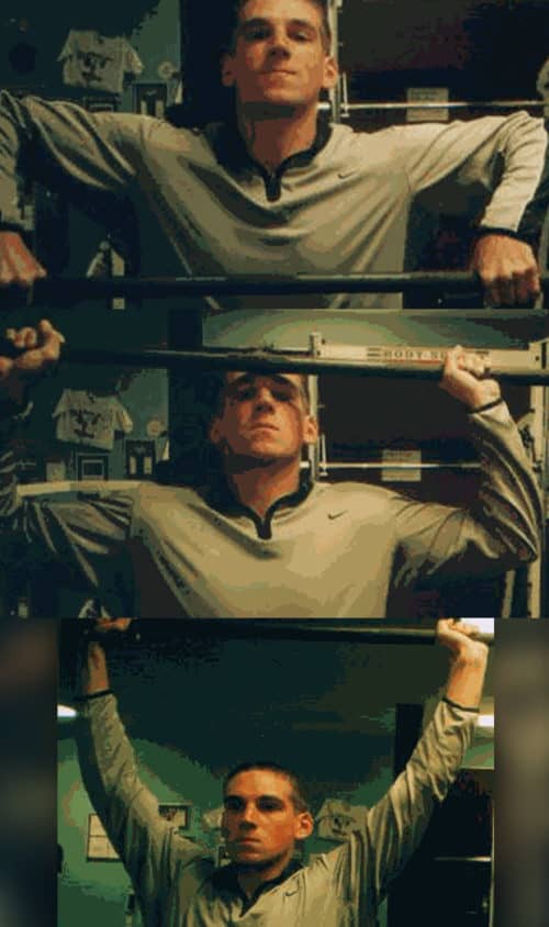 Press de banca cubano . Coge una barra y realiza un remo vertical con agarre ancho hasta que la barra esté unos 5-10 cm por debajo de la clavícula. Una vez que la barra alcance este nivel, mantén los codos firmes mientras giras los antebrazos como si estuvieras tratando de tocar la frente con la barra. Cuando se completa la fase de rotación externa, empuje la barra hacia arriba.