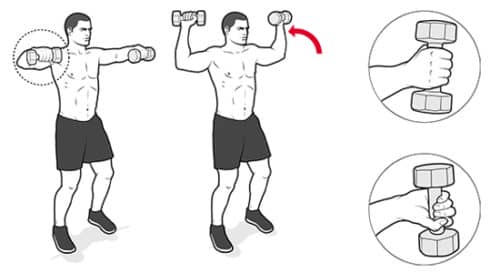 Mancuernas L-mahi a los lados . Para “rematar” el músculo infraespinoso ( m. infraspinatus ), toma mancuernas en cada mano, dobla los codos 90° y llévalos a los lados a 90°. Cuando los hombros estén paralelos al suelo, realiza (como en el ejercicio anterior) una rotación externa del húmero para que los antebrazos queden perpendiculares al suelo (como en la fase media del press militar).