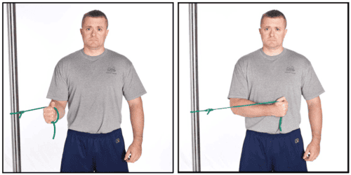 Para realizar la parte concéntrica del movimiento, gire externamente el húmero hacia afuera mientras trata de mantener el codo cerca de su posición original (aún se producirá un ligero movimiento en la articulación del codo) para trabajar predominantemente el músculo redondo pequeño ( m. teres minor ). Después de llegar al punto máximo, cuente hasta 2 y lentamente regrese su mano a su posición original. Repita 10-12 veces.