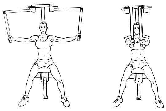 • Articulado sobre un largo brazo . En simuladores de este diseño, el atleta lleva los brazos ligeramente doblados a la altura de la articulación del codo. Esta forma de realizar el movimiento elimina la carga dinámica de los músculos deltoides e incluye los músculos dorsal ancho en el trabajo.