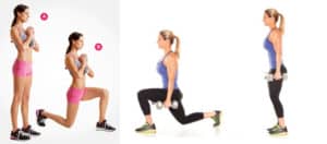Lunges – pasos con sentadillas. Los músculos de los glúteos están bien trabajados, porque cada pierna se tensa por turno. En este caso, las caderas deben doblarse lo suficientemente profundo.