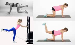 Balanceo de piernas hacia atrás (contragolpes). Otro gran entrenamiento de glúteos para mujeres. Involucra más fibras musculares en el glúteo mayor y menor que cualquier otro ejercicio. Se realiza tanto con su propio peso como en un simulador especial. Ambas opciones son efectivas. Es bueno combinar con columpios al costado (en la foto). Se recomienda realizar al final del entrenamiento con el fin de agotar y estimular los músculos tanto como sea posible.
