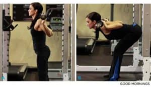 Inclinándose hacia adelante. Es necesario realizar solo con la ayuda de la contracción de los músculos de los glúteos. Mantén tu espalda recta. Coloque la barra en la base de su cuello (a través de su espalda). Pies separados al ancho de los hombros. Peso de la barra 10-15 kg. El ejercicio comienza empujando las nalgas hacia atrás mientras el torso se inclina hacia adelante. Levanta la cabeza para sostener la barra. El regreso a la posición inicial también se realiza reduciendo los glúteos. Aumente gradualmente el peso del proyectil.