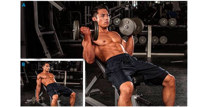 Para hacer esto, necesitará un banco inclinado. Tome una mancuerna en cada mano y deje que sus brazos cuelguen naturalmente a los costados. Doble lentamente el brazo con el peso, sosténgalo en la parte superior y luego bájelo lentamente. Este movimiento es excelente para activar los tríceps, así que mantén el movimiento fluido. Desde la posición inicial, estira aún más el bíceps, tensa el brazo y llévalo aún más atrás.