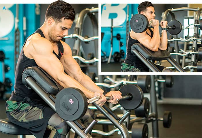 Siéntate en el banco Scott y ajusta la altura para que tus axilas toquen la parte superior. Tome una barra EZ a la altura de los hombros, con los brazos extendidos (pero los codos ligeramente flexionados). Realice un pliegue, presionando la parte posterior del hombro contra el banco. Baje la barra a su posición original durante al menos tres segundos.