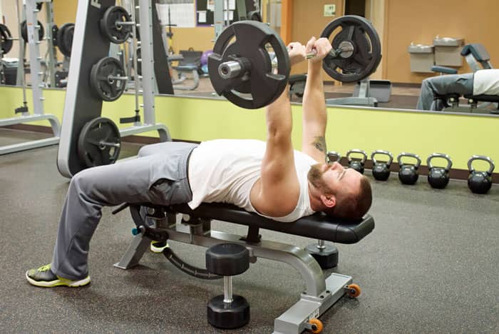 Sujete la barra de manera que sus dedos índices estén en el interior de la muesca (la parte áspera de la barra). Arquee la espalda para que haya un espacio entre la parte inferior de la espalda y el banco. Retire la barra del estante y bájela hacia el plexo solar de modo que los brazos formen un ángulo de aproximadamente 45 grados con respecto al cuerpo. Cuando la barra toque tu cuerpo, planta tus pies firmemente en el piso y empuja la barra hacia arriba. En la última serie, usa la mitad del peso y haz tantas repeticiones como puedas.
