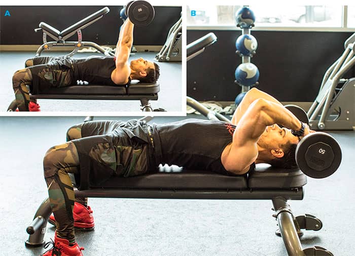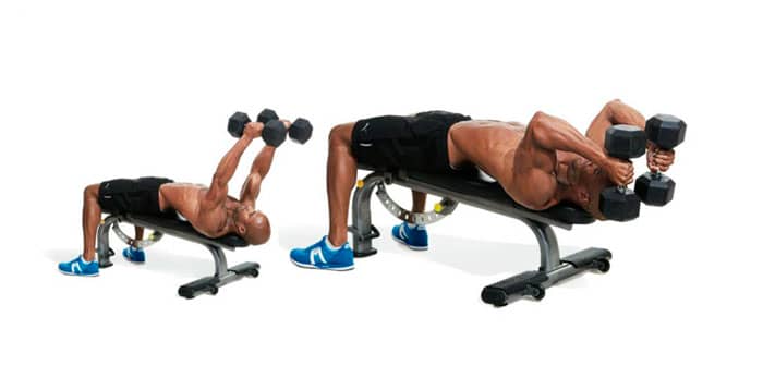 Acuéstese en un banco o en el suelo con una mancuerna en cada mano, los brazos extendidos sobre el pecho y las palmas hacia los pies. Gira los codos para que miren hacia los lados y dóblalos para que las pesas caigan casi sobre el pecho. Extiende tus brazos.