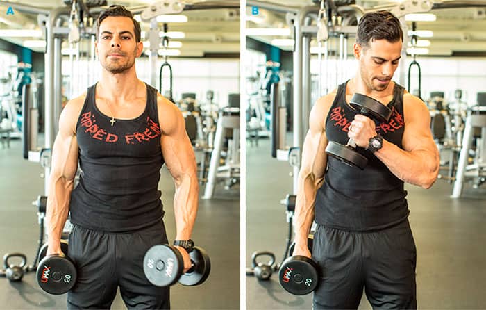 Se puede hacer en casa. Tome una mancuerna en cada mano, las palmas deben estar hacia el cuerpo, los brazos extendidos hacia abajo. Manteniendo los brazos cerca del cuerpo, dóblese con ambos brazos al mismo tiempo, minimizando el balanceo durante el levantamiento.