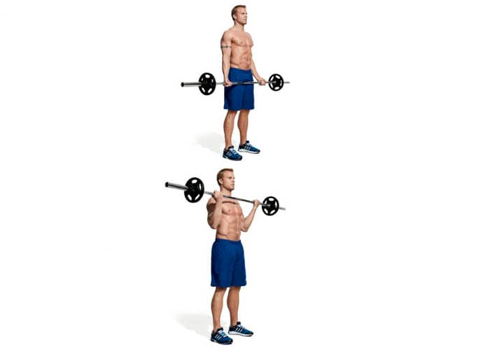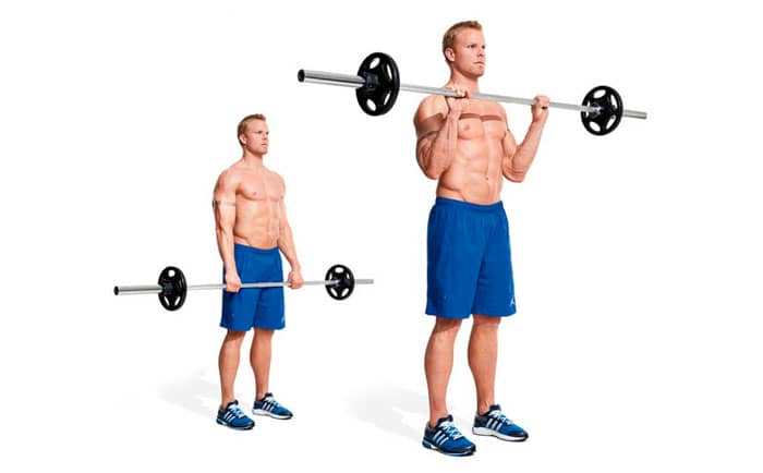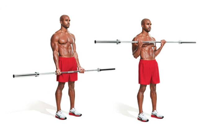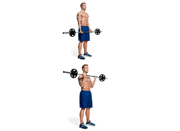 Sujete la barra con un agarre regular ligeramente más ancho que el ancho de los hombros, y también coloque las piernas separadas al ancho de los hombros. La barra debe estar frente a las caderas, con los codos apuntando hacia atrás. Dobla los brazos y lleva la barra a los hombros. Los hombros deben permanecer inmóviles, las rodillas ligeramente flexionadas. Llevando la barra a tus hombros, regresa tus codos a su posición original.