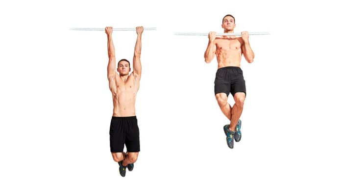 Tome la barra con un agarre en pronación al ancho de los hombros (o un poco más angosto). Aprieta los abdominales y levántate de modo que la barbilla quede por encima de la barra. Trate de no balancearse para realizar el movimiento de manera más eficiente.