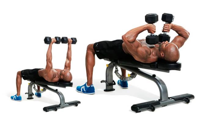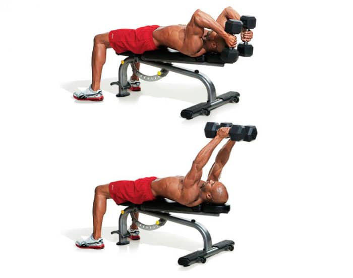 Coloca el banco con una ligera inclinación (unos 30 grados) y túmbate sobre él con una mancuerna en cada mano. Sostén las pesas sobre tu pecho con las palmas de las manos enfrentadas. Doble los codos y baje las pesas a los lados de la cabeza. Elige un peso con el que puedas hacer 12 repeticiones en la primera serie y úsalo para cada serie.