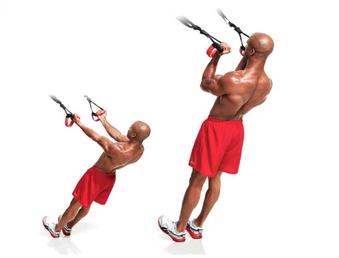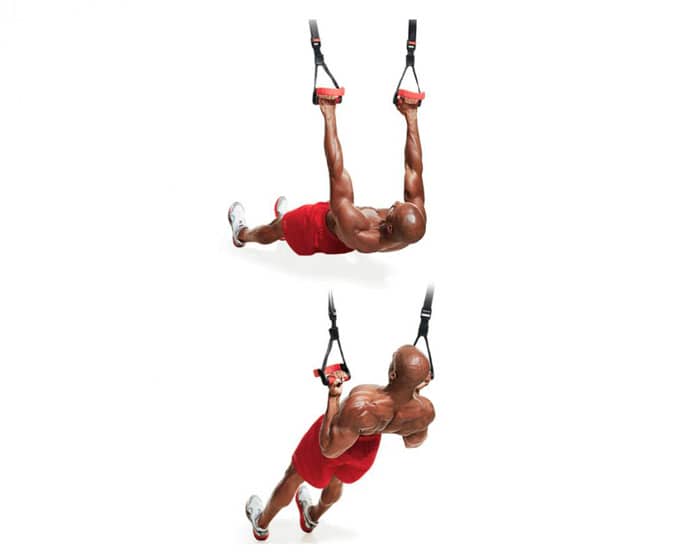 Sujete las asas e inclínese hacia atrás con los brazos extendidos para que su cuerpo esté sostenido por los bucles y solo sus talones descansen en el suelo. Aprieta tus abdominales y tira de tu cuerpo en una línea. (Cuanto más bajas estén las manijas, más difícil será el ejercicio. Para mayor dificultad, puede poner los pies en una plataforma elevada). En la posición inicial, las palmas deben mirar hacia las piernas, mientras tira hacia arriba, gira los cepillos para que en la parte superior de las palmas miren hacia arriba.
