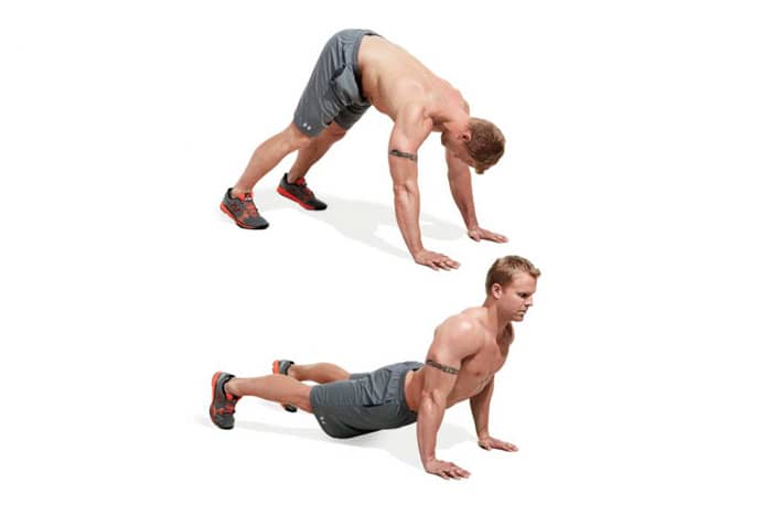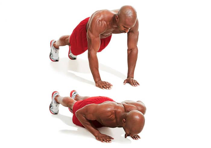 En posición acostada, coloque las manos más estrechas que el ancho de los hombros y baje el cuerpo hasta que el pecho quede unos centímetros por encima del suelo. Para mayor dificultad, puedes poner tus pies en un banco o caja. Bueno para una chica.
