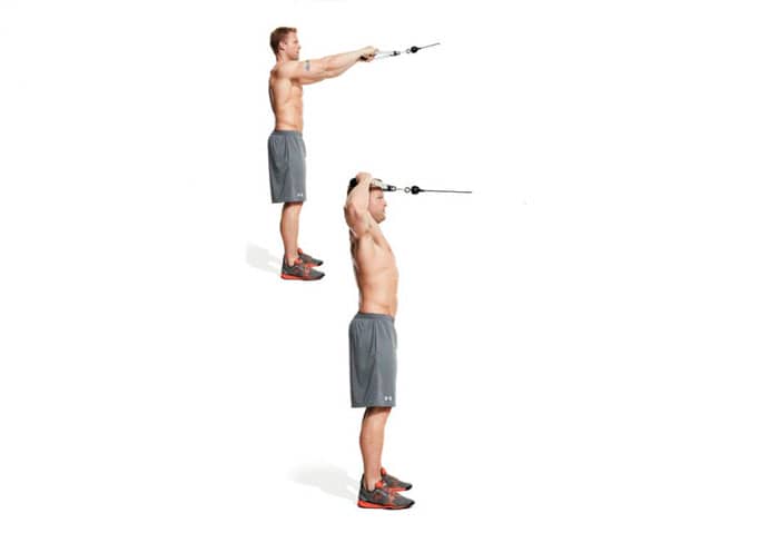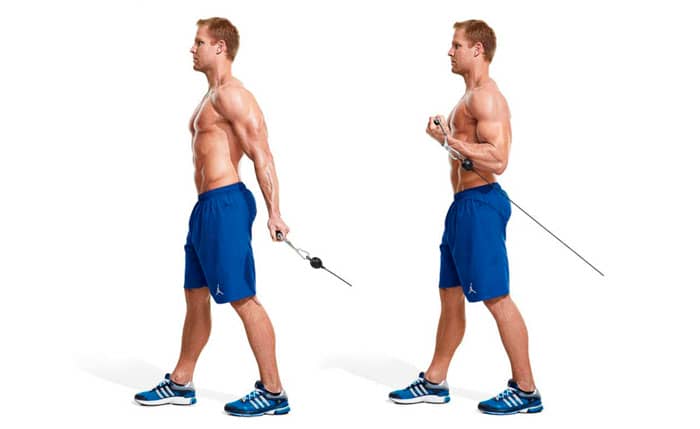 Este es un ejercicio de brazo en el gimnasio. Para este ejercicio, necesitará una máquina de cable. Párese de espaldas a la máquina y agarre el cable por encima de su cabeza con una barra recta. Debe estar aproximadamente al nivel del pecho, por lo que tus brazos estarán doblados en un ángulo de 90 grados. Tira de la cuerda. Como tus codos están presionados contra tu cuerpo, ejercitarás principalmente las cabezas laterales y medias. Baje el peso lentamente para trabajar la parte interna de la cabeza del bíceps.