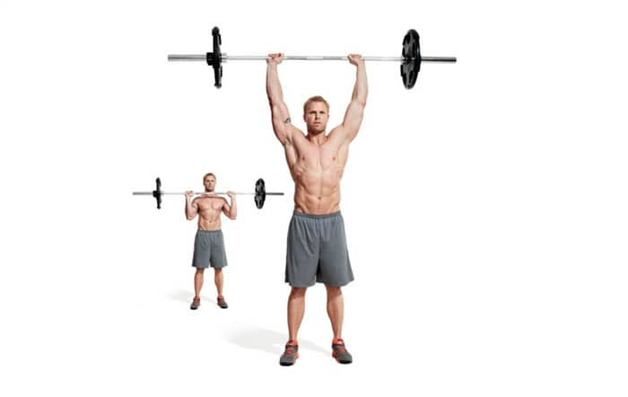 Coloque la barra en bastidores y tómela más ancha que sus hombros. Retire la barra del soporte y sosténgala a la altura de los hombros, con los antebrazos verticales. Apriete la barra firmemente, apriete la prensa. Empuje la barra sobre su cabeza, extendiendo su cabeza hacia adelante y aplastando el trapecio en la parte superior del movimiento.