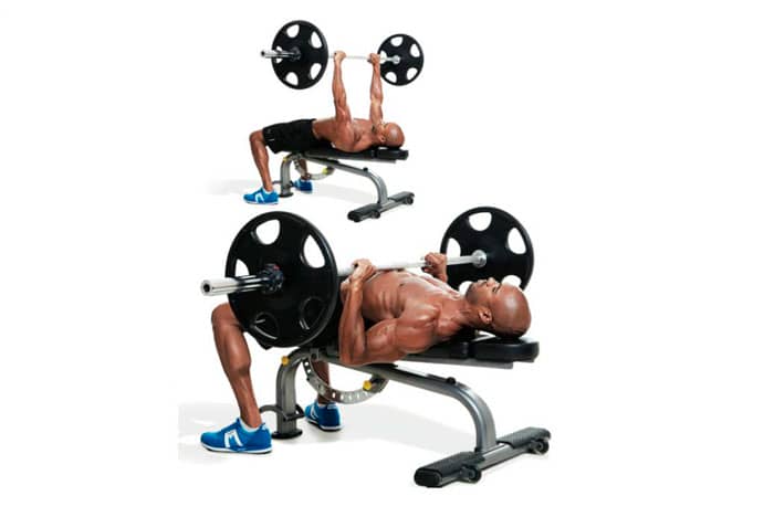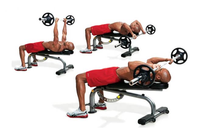 Para este ejercicio de construcción de brazos, use una barra corta (o mancuernas si lo prefiere, pero esto requerirá un esfuerzo adicional para mantener el equilibrio, por lo que si tiene hombros débiles, es mejor comenzar con una barra). Acuéstese en un banco y sostenga una barra cargada sobre su cabeza. Es mejor que los codos estén ligeramente doblados al mismo tiempo, el agarre debe ser estrecho.