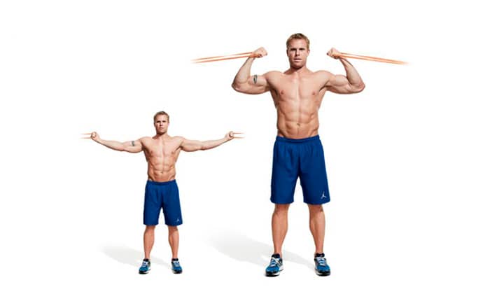 Fije dos correas a objetos estacionarios espaciados a la altura de los hombros. Párese entre ellos, sosteniendo cintas en cada mano. Levanta los brazos extendidos a 90 grados, en la posición inicial debes sentir algo de tensión en las bandas. Dobla los brazos hacia las orejas y mantén esta posición durante dos segundos.