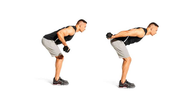 Tome una mancuerna en cada mano y doble la cintura para que la parte superior de su cuerpo quede casi paralela al piso. Gire las palmas de las manos para que miren hacia el suelo y, presionando las manos a los lados, estire los codos hasta que los brazos queden paralelos al cuerpo.