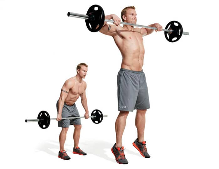 Sujete la barra a aproximadamente el doble del ancho de sus hombros y sosténgala en sus caderas. Doble las rodillas y la espalda baja para que la barra quede directamente sobre las rodillas. Con un movimiento explosivo, endereza la parte inferior de la espalda como si estuvieras saltando y tira de la barra hasta el nivel de los hombros, con los codos separados.
