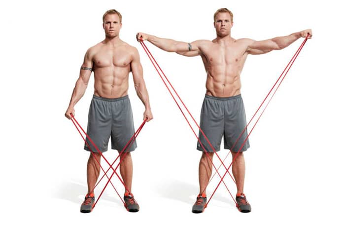 Pisa el extremo inferior de cada banda elástica con el pie opuesto a la mano con la que la sostienes, de modo que las bandas formen una X frente a tu cuerpo. Levanta los brazos hacia los lados 90 grados hasta que tus hombros queden paralelos al piso. .