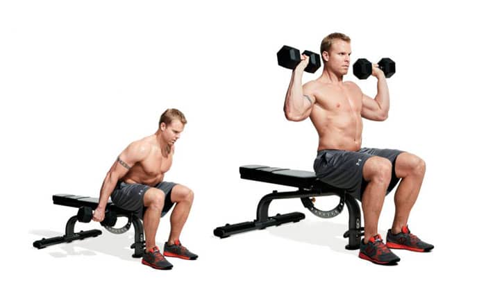 Coge una mancuerna en cada mano y siéntate en el borde de un banco. Inclínese hacia adelante, manteniendo recta la parte baja de la espalda. Estire explosivamente su cuerpo y levante las pesas hasta que sus antebrazos estén verticales. Permita que el impulso gire sus manos para que atrape las pesas en algún lugar al nivel de los hombros.