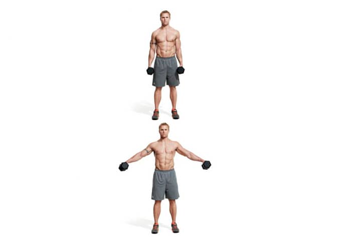 Tome una mancuerna en cada mano, estire los brazos a lo largo del cuerpo. Sin usar el trapecio, usa tus manos para balancear las pesas diez centímetros hacia arriba. Tus brazos y tu cuerpo forman una V invertida. Piensa en ello como una elevación del deltoides, pero con un swing y menos rango de movimiento.