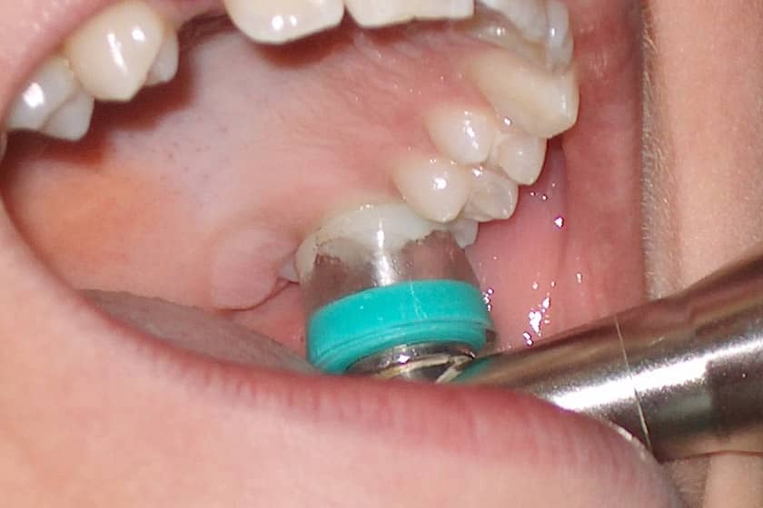 En este caso, las áreas afectadas se tratan con un chorro de arena, que entrega la composición a alta presión. Esto le permite eliminar fácilmente y sin molestias las áreas de tejido duro afectadas por la caries.