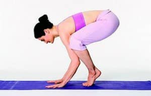 - Dobla los codos, levanta los talones del suelo y apoya las rodillas en la parte exterior de los hombros. Mantén los dedos de los pies en el suelo, tus abdominales están contraídos y tus piernas metidas en tus brazos. Mantenga durante 5-10 respiraciones.