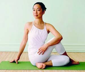 - Gire a la derecha lo más que pueda, alejándose de la región abdominal; mantenga ambos lados de su lazo en el suelo. Permanece en la postura durante 1 minuto.