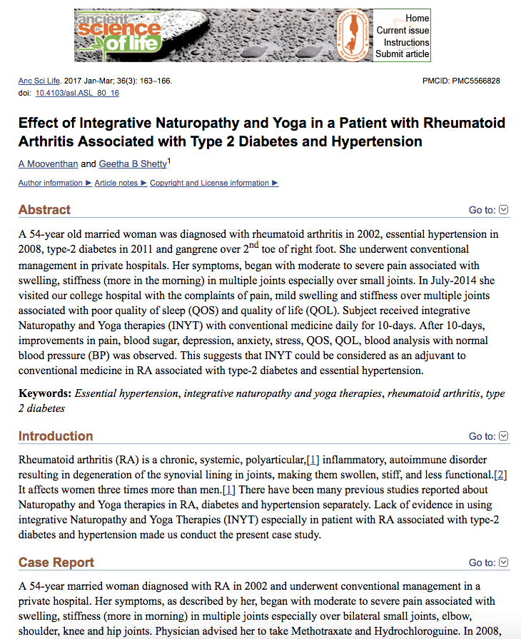 Caso clínico: el efecto del Yoga y terapias naturales sobre la artritis reumatoide tiene resultados positivos sobre el dolor, depresión, ansiedad, niveles de azúcar en sangre y presión arterial: